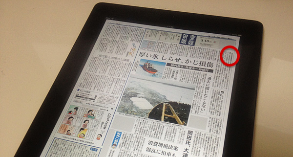 画面にそのまま新聞が表示はされるんですが、旧iPadの場合は文字がつぶれて拡大しないと読めなかったんですよね。