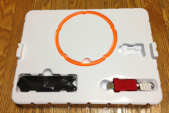 下の段には予備のプロペラ、充電装置となるUSBケーブル、足を固定するために使うオレンジのパーツが入ってます。