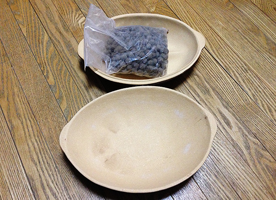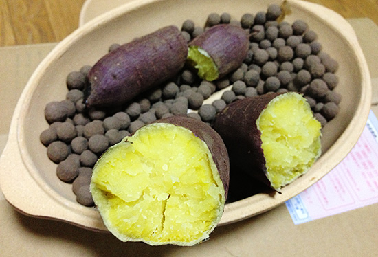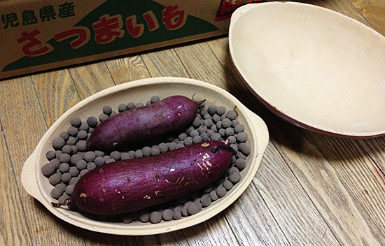 作り方は簡単で、セラミックボールを敷き詰め、洗った芋を並べるだけです。