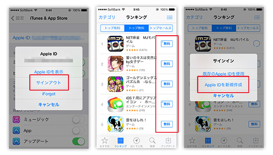 まず、一度サインアウトし、AppStoreに接続。その後無料のアプリのどれでもいいのでダウンロードします。