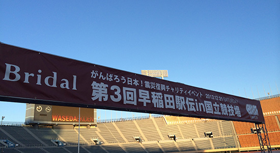 国立競技場に到着。この日は早稲田駅伝をやっていたのですが、ちょうど終了した後で、トラックに降りて撮影することができました。