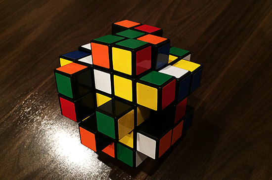通常のルービックキューブは3x3の9個のキューブが3列に並んでますが、X-CUBEは21個のキューブが3列に並んでいます。