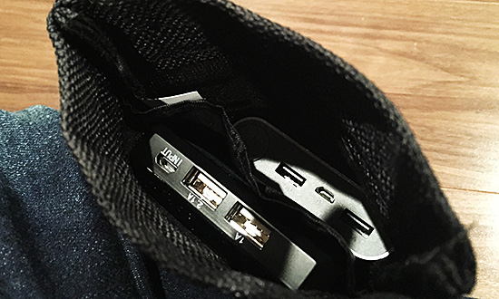 専用のポーチは中に仕切りがあるので、このように二つのバッテリーを入れて持ち運ぶこともできます。
