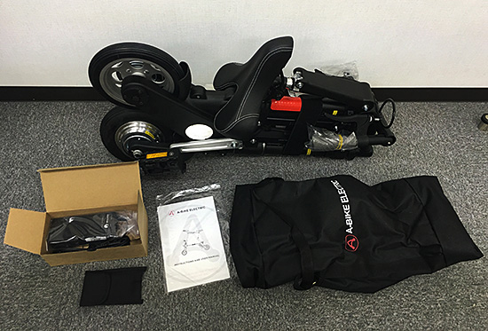 梱包物はA-bike Electric他、充電器、ケース、説明書、工具が入ってました。
