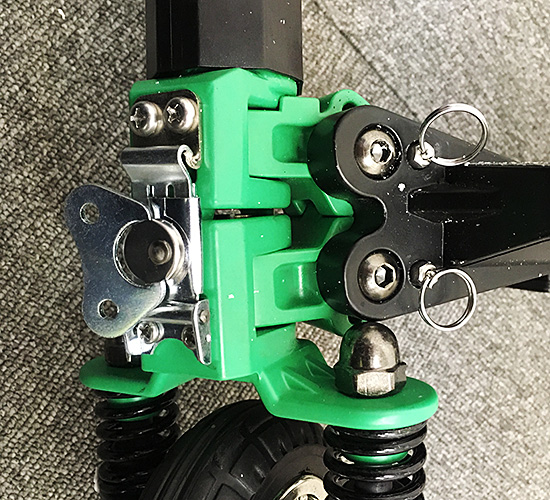 組み立ては簡単で、まず前面にある上下のピンを引っ張りタイヤとハンドルを起こし固定します。