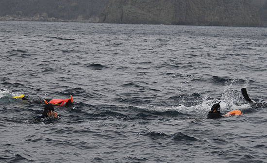 イルカたちを水中で見るため、イルカの群れにタイミングを見計らって飛び込みます!